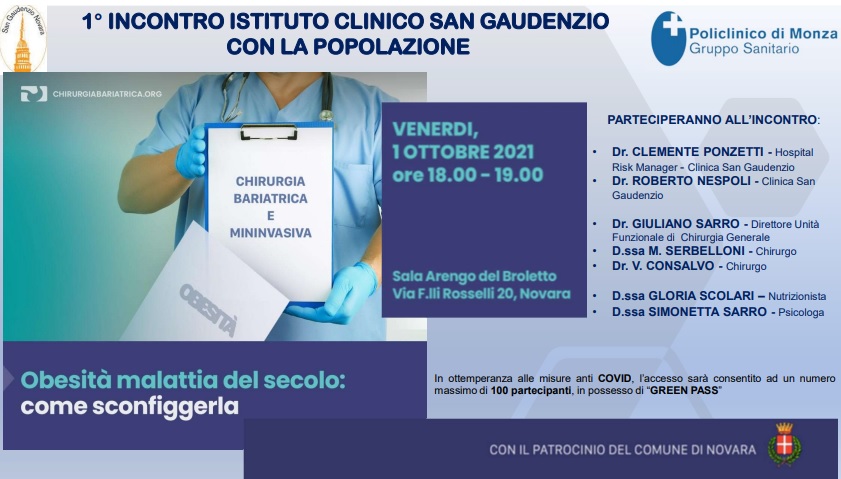 Si svolgerà il prossimo venerdì 1 ottobre 2021 dalle ore 18:00 alle ore 19:00 il primo incontro dell’Istituto Clinico San Gaudenzio con la popolazione dedicato all’obesità.