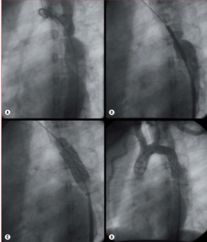 La parte diagnostica è simile alla procedura di angioplastica con palloncino. Dopo aver eseguito l’angiografia in proiezione obliqua anteriore sinistra e laterale, si misurano il diametro del tratto coartato, dell’aorta prossimale e distale all’ostruzione e il tratto che dovrà essere “stentato”. Tutte le misure devono essere eseguite in due proiezioni e poi farne la media. Dopo aver attraversato la coartazione per via retrograda, con un catetere MP, si posiziona una guida Amplatzer extra-stiff con punta “J” nella succlavia destra. Dopo aver rimosso il MP, si porta un long sheath Cook o simili oltre il tratto stenotico. Nei bambini e negli adulti si possono usare gli stent premontati su palloncino, ma la maggior parte dei Centri usa il BIB (balloon in balloon), per prevenire rotture del pallone e dislocazioni dello stent. Il calibro dell’introduttore femorale dipende dallo stent usato. Il palloncino deve essere poco più lungo dello stent, che viene posizionato a cavallo della stenosi. Si eseguono dei test angiografici per verificarne la posizione.